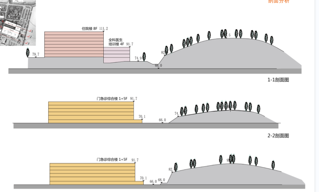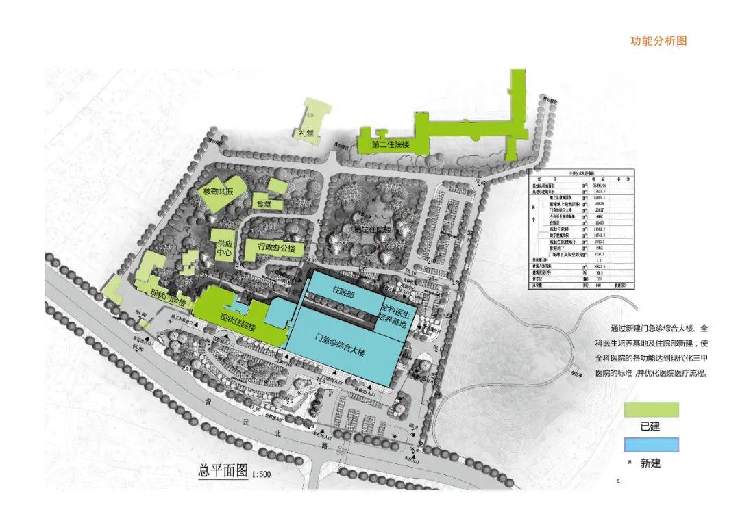 保留医院东侧山体景观的自然形态,保留院内古树,将自然景观与建筑共生。