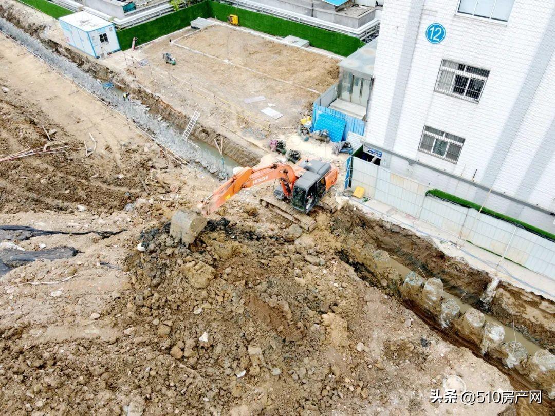 在航拍图中可以看到,现场已经全部被围挡围起来了,挖掘机正在进行挖土工作,部分土地已经平整完毕。